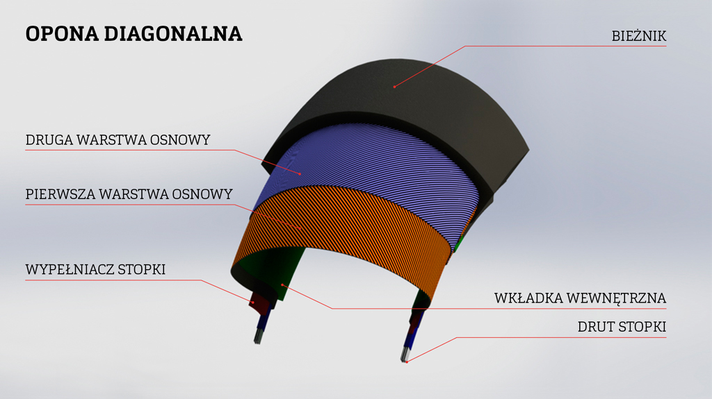 Opony diagonalne mają najdłuższą tradycję i są najbardziej rozpowszechnione na rynku. Karkas opony diagonalnej składa się z dwóch lub więcej warstw kordu tekstylnego (rayon, nylon, poliester), które są skrzyżowane pod pewnymi kątami. Opony diagonalne są właściwym wyborem dla mniejszych motocykli o mniejszej pojemności, skuterów i starszych motocykli, których podwozie jest przystosowane do opon diagonalnych.